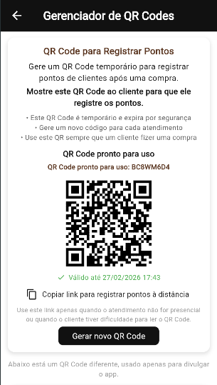 Este QR dinâmico é usado pelo estabelecimento para registrar pontuação e validar resgates.